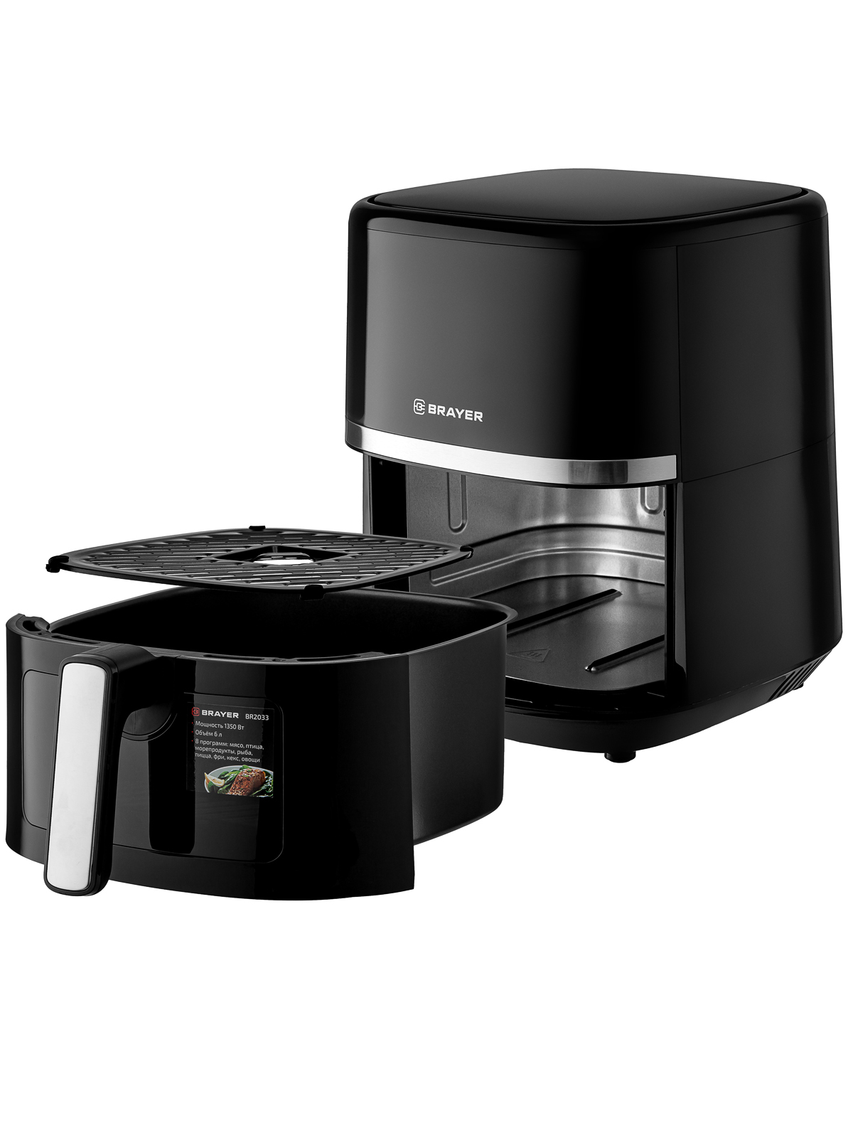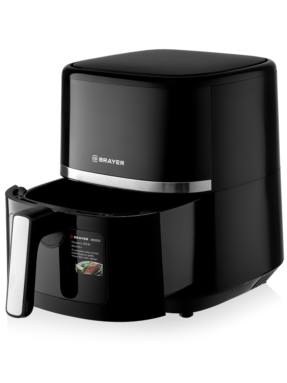 Аэрогриль BRAYER BR2033 — это многофункциональное устройство для приготовления различных блюд. Он оснащён 8 программами для готовки (мясо, птица, морепродукты, рыба, пицца, фри, кекс, овощи), функцией подогрева пищи и сенсорным управлением с LCD-дисплеем. Максимальная мощность аэрогриля составляет 1350 Вт, объём — 6 литров. Таймер можно установить до 60 минут, а температура регулируется от 80 до 200 °С. Корпус аэрогриля выполнен из высокопрочного термостойкого пластика.