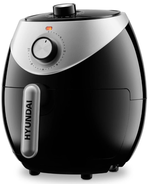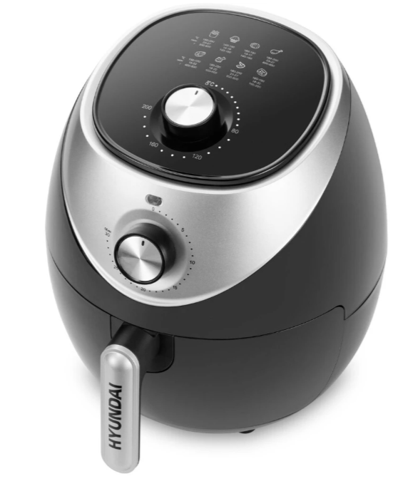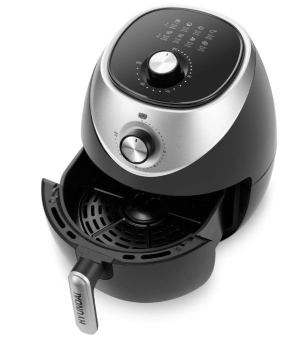 Аэрогриль Hyundai HYF-3456 - современный кухонный помощник в стильном чёрно-серебристом дизайне. Прибор оснащён мощным нагревательным элементом (1500 Вт) и вместительной антипригарной корзиной объёмом 3,2 литра, что позволяет готовить блюда для всей семьи.