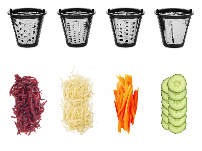 В комплект входят три насадки: крупная тёрка, мелкая тёрка и шинковка. Это позволяет получать разные виды нарезки: от крупной стружки до тонких ломтиков.Корпус электротёрки выполнен из прочного пластика, а съёмные детали легко моются под проточной водой или в посудомоечной машине. Компактный размер и удобная ручка делают процесс измельчения комфортным и быстрым.