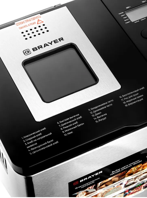 Хлебопечь BRAYER BR2705 — это многофункциональный кухонный прибор, который позволит вам в домашних условиях готовить свежий ароматный хлеб и другие выпечные изделия. Устройство оснащено 19 автоматическими программами, включая режимы для пшеничного, ржаного, бездрожжевого хлеба, кексов, джема и замеса теста.