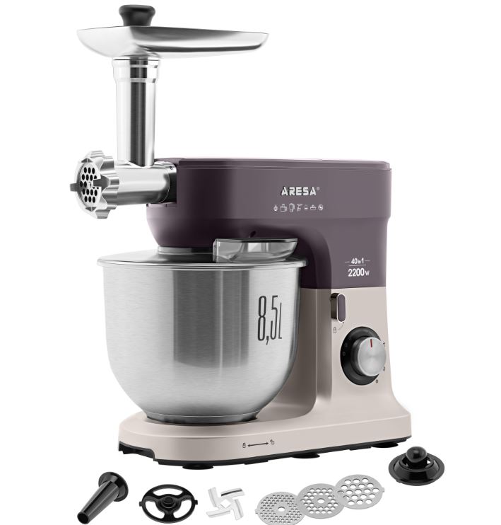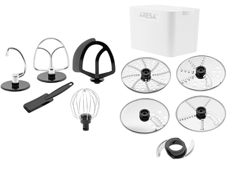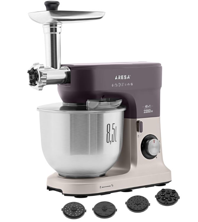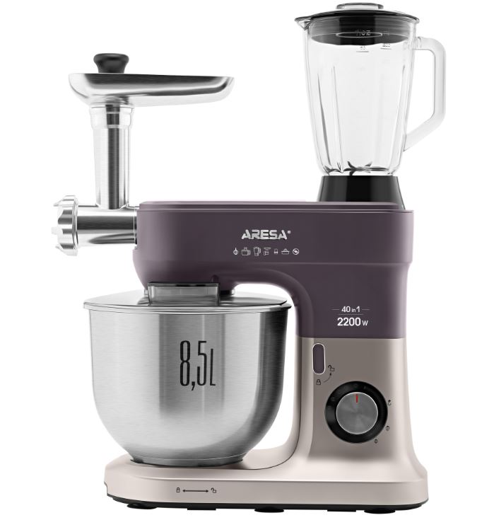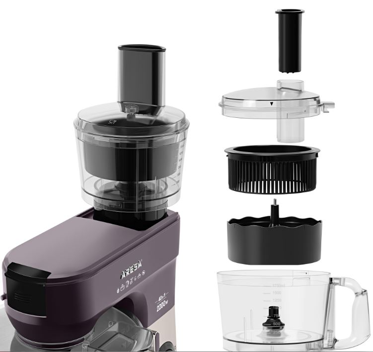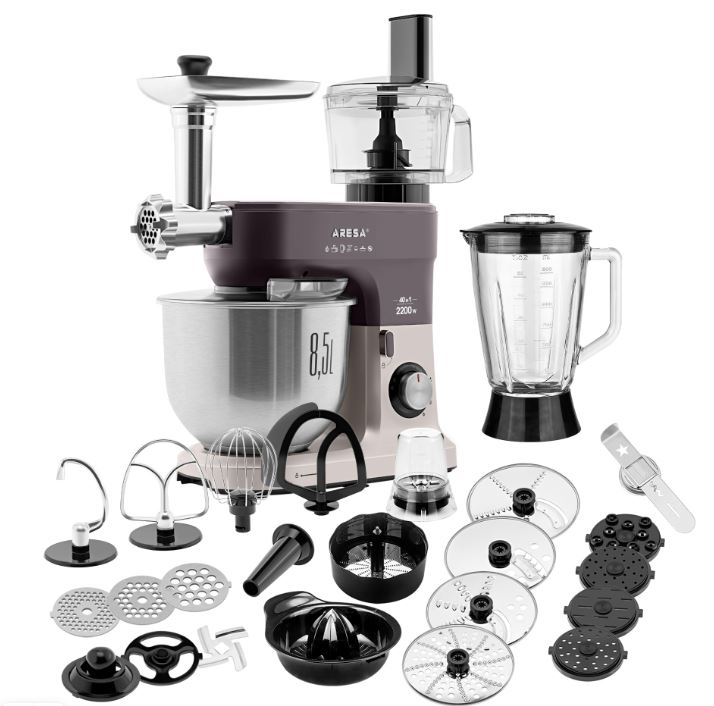 Кухонный комбайн ARESA AR-1710 — это многофункциональный прибор, который заменяет сразу несколько устройств: миксер, мясорубку, блендер, измельчитель, кофемолку, соковыжималку, устройство для приготовления печенья и макарон. В комплекте идут насадки для приготовления различных блюд.