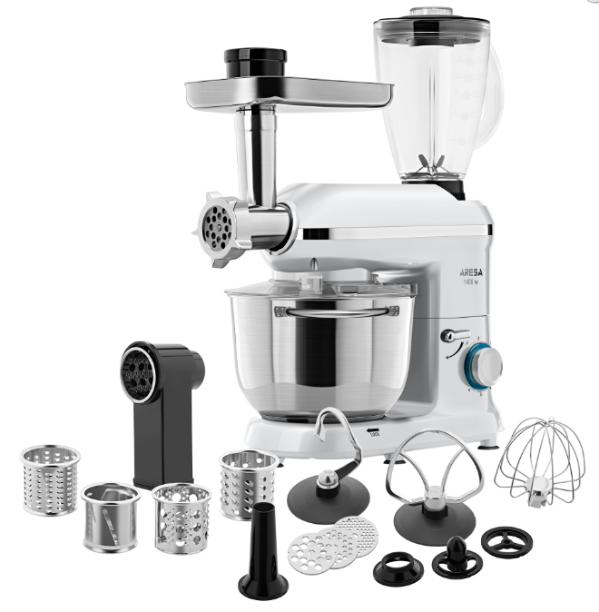 Кухонный комбайн ARESA AR-1713 — это многофункциональное устройство, которое сочетает в себе функции миксера, мясорубки, блендера и овощерезки. Он оснащён планетарной системой смешивания, что обеспечивает равномерное перемешивание ингредиентов.