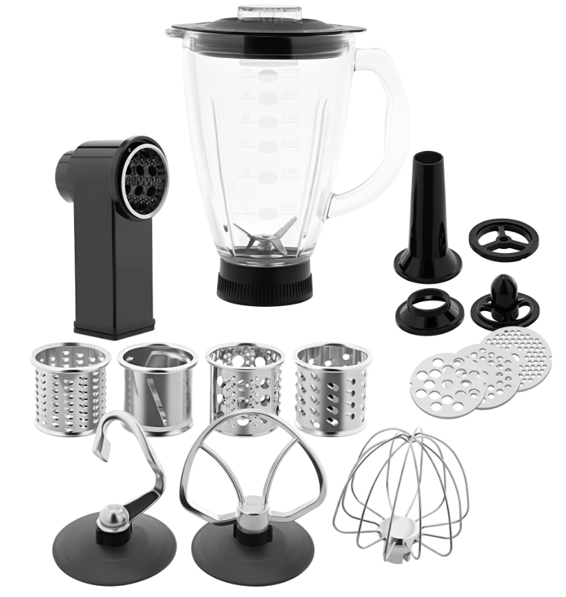 В комплект входят съёмная чаша из нержавеющей стали объёмом 4,5 литра, венчик для взбивания, крюк для замешивания теста, насадка для смешивания, мясорубка с тремя решётками для разного размера измельчения, насадки для приготовления колбасок и кеббе, а также режущий нож и шнек.