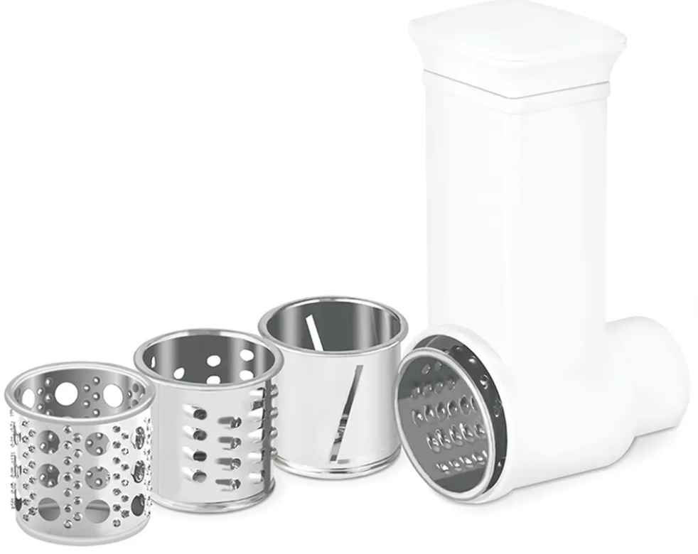 Насадка овощерезка ARESA AR-3804 предназначена для использования с мясорубкой ARESA AR-2106. Она состоит из четырёх сменных металлических тёрок и удобного толкателя. Насадка позволяет выполнять нарезку, мелкую и крупную тёрку, а также готовить драники.