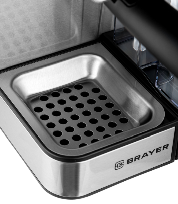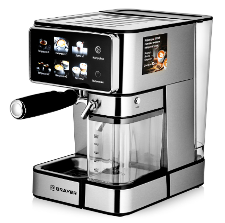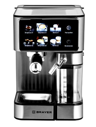 Кофеварка BRAYER BR1149 — рожковая модель мощностью 1350 Вт с давлением 20 бар для приготовления эспрессо, капучино, латте и американо. Оснащена сенсорным управлением, автоматическим капучинатором и резервуаром на 1,8 л. Позволяет готовить одну или две чашки одновременно, имеет съёмный поддон и контейнер для молока (0,5 л). Корпус — металл и пластик.