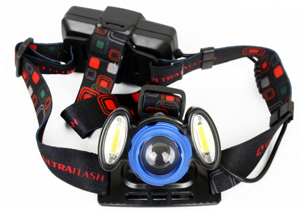 Фонарь Ultraflash электрический светодиодный налобный аккумуляторный. Источники света — светодиод XML-T6 с потребляемой номинальной мощностью 4 Вт.. Дистанция освещения — до 250 метров. Есть 4 режима работы — XML-T6 / 2 боковых COB LED / все LED BOOST / мигалка. Присутствует возможность работы и от одного, и от двух аккумуляторов, формата 18650 Li — Ion аккумулятора с напряжением DC 3,7 В емкостью по 800 мА-ч,. Возможность работы напрямую от Powerbank через вход Micro USB.