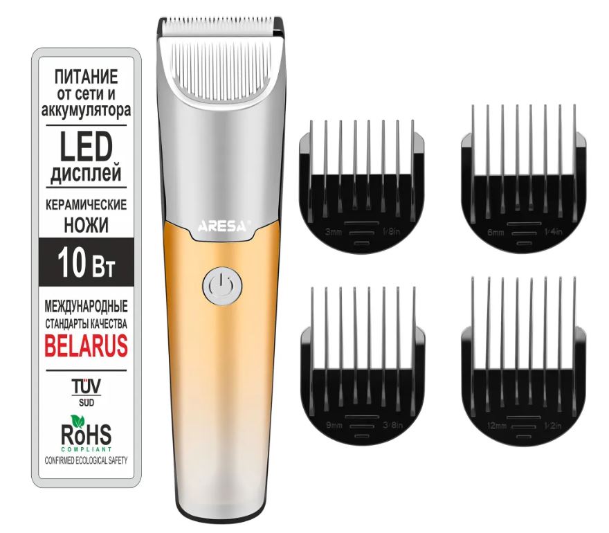 Машинка для стрижки ARESA AR-1820 — это триммер, который работает от сети и аккумулятора. Он оснащён встроенным литиевым аккумулятором ёмкостью 2000 мАч, который обеспечивает время работы около 180 минут. Быстрая зарядка составляет 3,5 часа. Триммер имеет LCD-дисплей, неподвижное лезвие из нержавеющей стали и подвижное керамическое лезвие. Регулируемая длина лезвия позволяет выбирать между четырьмя съёмными насадками: 3, 6, 9 и 12 мм. Функция блокировки обеспечивает безопасное и точное удаление волос. В комплекте с машинкой идут удобная подставка для хранения, 4 съёмные насадки, щёточка для чистки лезвий, маслёнка, ножницы, расчёска и USB-кабель.