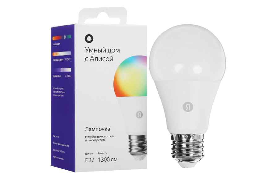 Умная LED-лампочка Яндекс YNDX-00553 с цоколем E27 — это светодиодная лампа, которая позволяет управлять освещением через приложение «Дом с Алисой» или голосовые команды с помощью Алисы (например, через Яндекс Станцию). Она подходит для создания системы умного дома или расширения её функционала. Яркость и цвет освещения изменяются пользователем. Максимальный световой поток лампы составляет 1300 лм. Предельное энергопотребление модели – 11 Вт. Управлять устройством можно с помощью голосового помощника Алиса.