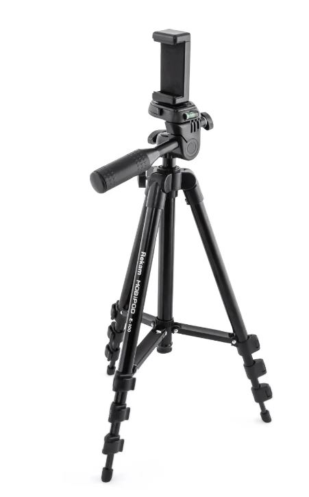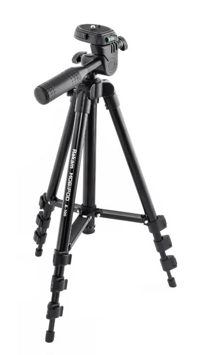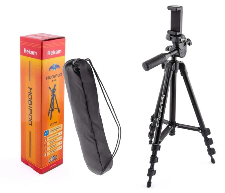 Штатив Rekam Mobipod E-100 — это алюминиевый трёхногий штатив чёрного цвета. Он оснащён универсальным съёмным держателем для смартфонов с экраном до 6,5 дюймов. Максимальная нагрузка составляет 2 кг, а максимальная высота — 100 см. Штатив имеет жидкостный уровень, быстросъёмную площадку для крепления камеры и панорамную 3D-голову. В комплекте идёт прочная сумка-чехол.