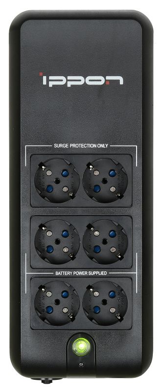 Источник бесперебойного питания IPPON Back Verso 800 черный включает в себя 6 розеток вида EURO. Защитит вашу офисную технику от резких скачков напряжения, коротких замыканий и перебоев в электросети. При половинной нагрузке, время работы составляет 6.2 минуты, а при полной-1.5 минуты.