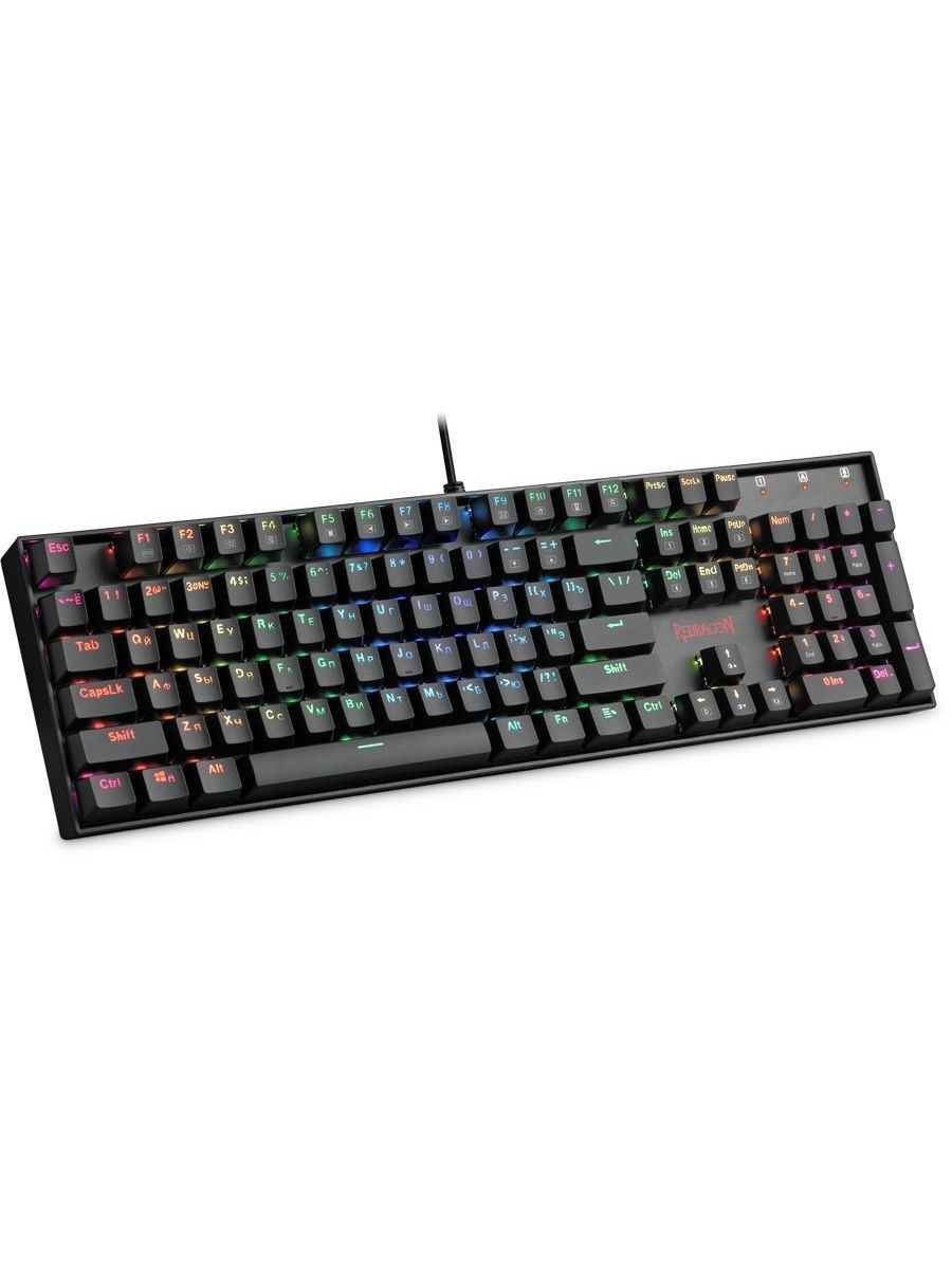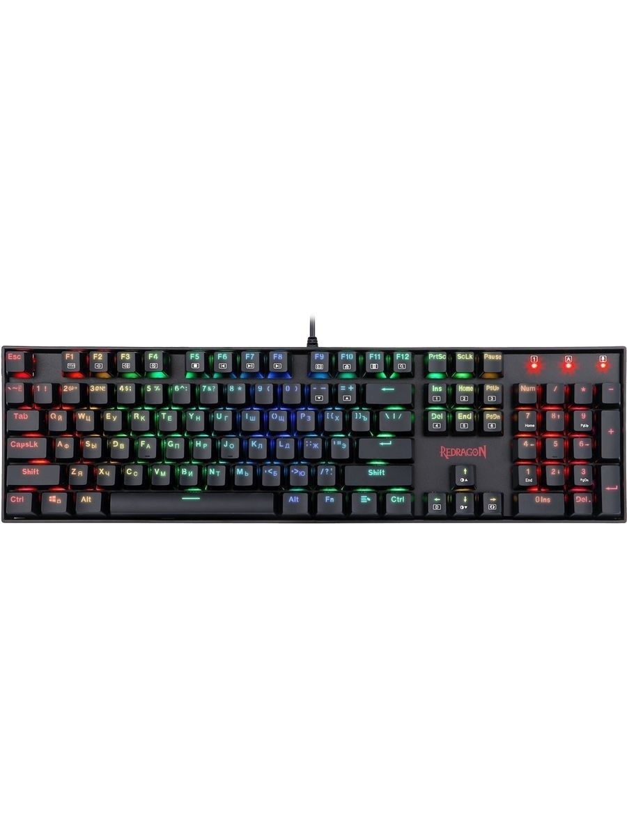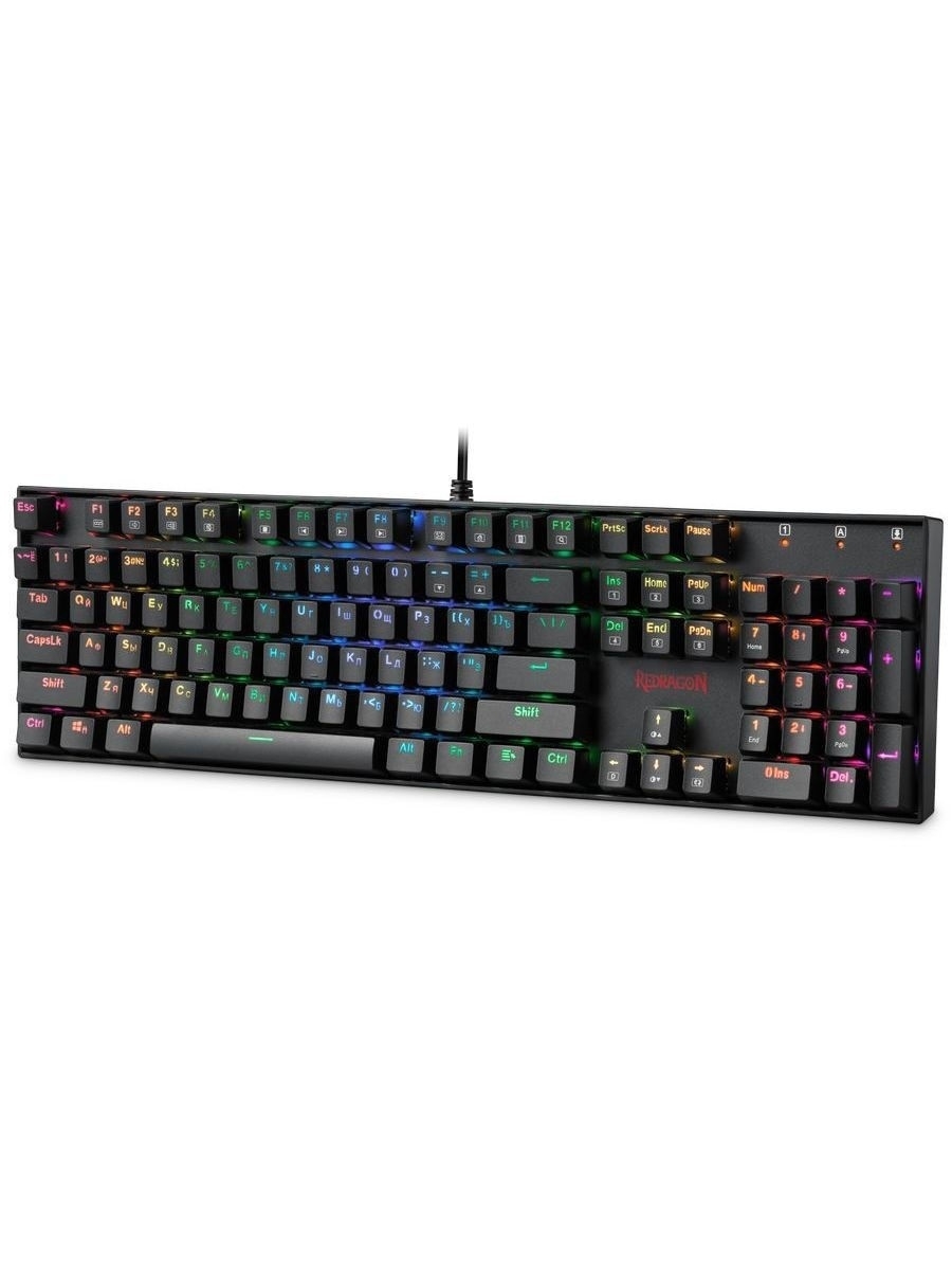 Redragon Mitra - игровая проводная механическая клавиатура. с подсветкой клавиш. Имеет цифровой блок, клавишу функции (Fn), корпус Skeleton. Общее количество клавиш 104, длина провода 1.8 м, корпус влагозащищен. В комплекте идет документация, пуллер для кейкапов. Корпус сделан из пластика и металла.