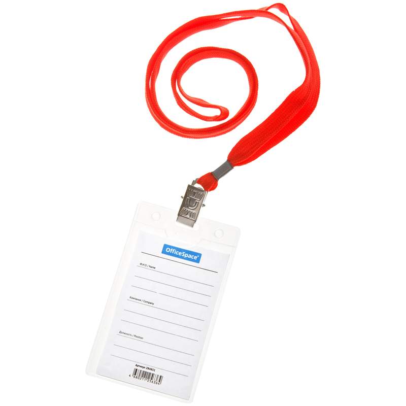 Бейдж вертикальный из мягкого прочного пластика. Съемный текстильный шнурок крепится к бейджу с помощью металлической клипсы. Цвет шнурка - красный. В комплект входит вкладыш с полями для персональных данных. Подходит для пропуска, визитки, именной карточки.