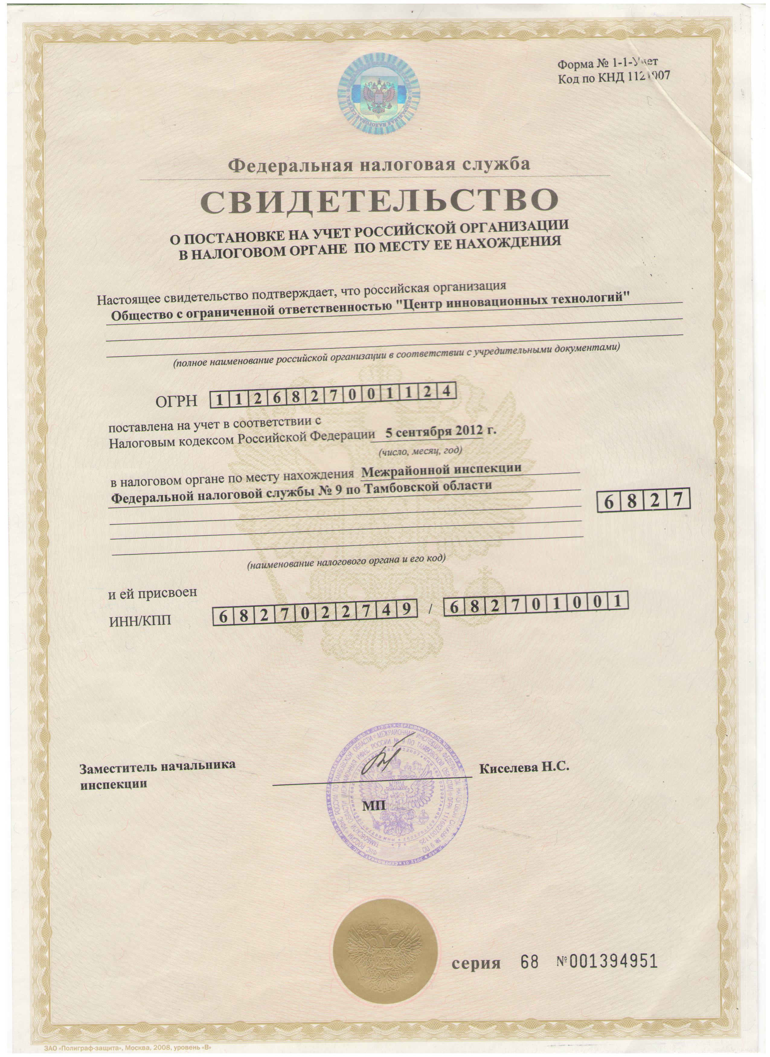- Свидетельство о постановке на учёт российской организации в налоговом органе по месту её нахождения.
