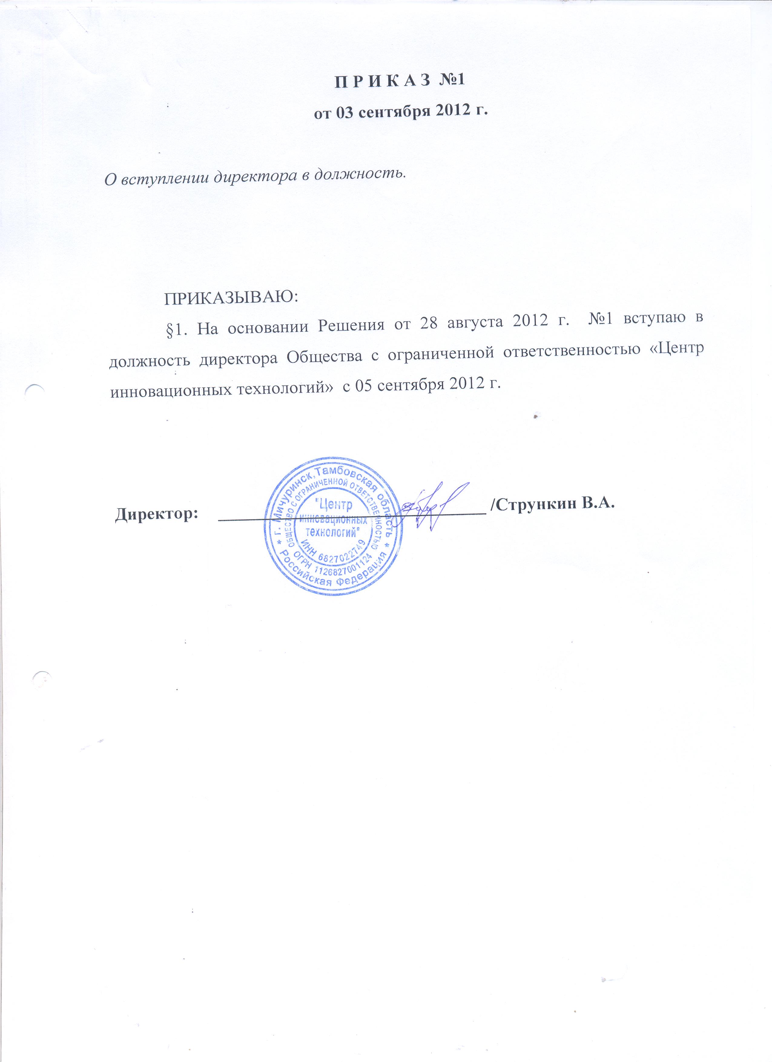 - Приказ о вступлении директора в должность.